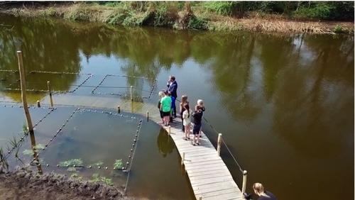SINT-OEDENRODE – Streekpark Kienehoef is een nieuwe kunst-attractie rijker: een waadpad. Het is een pad dat net onder de oppervlakte van de vijver in het park ligt. Het is gemaakt door kunstenares Sannah Belzer. Bezoekers kunnen met speciale waadschoenen over dat houten pad lopen en bijvoorbeeld proefjes doen om de waterkwaliteit te meten.